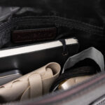 4.ดีไซน์กระเป๋าเพิ่มช่องด้านหน้า แต่งอะไหล่สายล็อคปิด ตัดขอบหนังสกรีนลายโลโก้