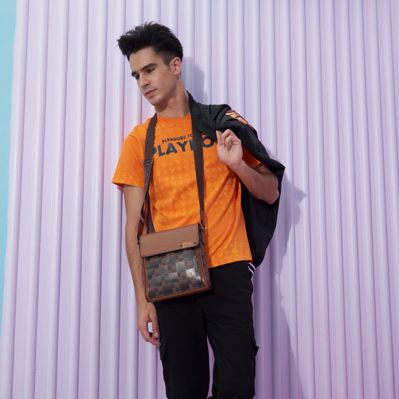 Playboy Shoe&Bag TH กระเป๋าชายแมสเซนเจอร์สกรีนลายหมากฮอตบน PVC-น้ำตาล ST-B232PBM238-BR